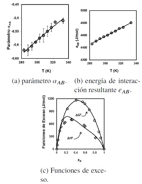 (a) parámetro αAB. (b) energía de interacción resultante e AB. (c) Funciones de exceso. (◦) Energía libre de Gibbs en exceso, (♦) datos experimentales de entalpía en exceso a 308,1 K [62], (−) modelo SIMÉTRICO (ecuaciones (6) y (18)).