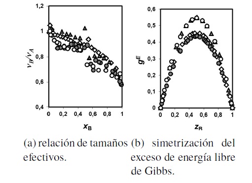 La forma propuesta por Castellanos-Suárez y García-Sucre [13] para evidenciar la dependencia funcional de los contactos efectivos, νj/νi , con la composición, consiste en determinar explícitamente, punto a punto, aquellos valores de νj/νi que simetricen el exceso de energía libre de Gibbs con respecto a la fracción de volumen efectivo.