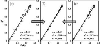 La segunda forma de parametrizar, es más rigurosa y es la que empleamos en este trabajo, y consiste en garantizar que la energía libre de Gibbs alcance la simetría. Si partimos del hecho que debe existir un valor de αAB tal que simetrice la energía libre de Gibbs, de acuerdo con lo expresado en la ecuación (6). Entonces en este punto, gE vs zA zB debe presentar un comportamiento lineal (factor de correlación R2 → 1). Note, que aunque no existe una relación algebraica entre sus parámetros, sin embargo, la pendiente de la recta ( βAB) guarda una dependencia implícita con αAB . Este procedimiento de simetrización, convierte a las Ecuaciones (9). (10) y (11) en un conjunto de ecuaciones con un sólo parámetro ajustable con se visualiza en la Figura 2.