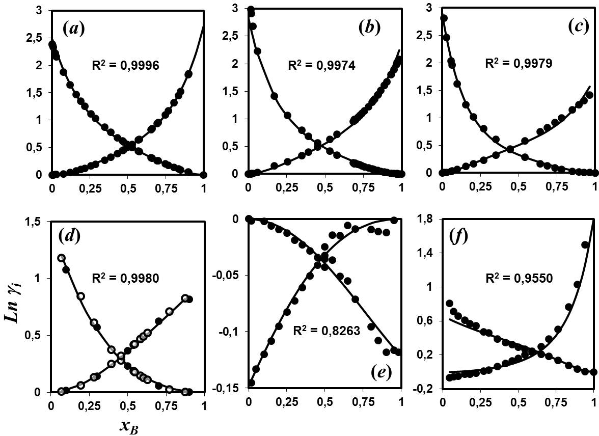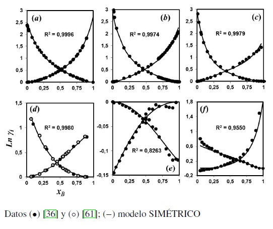 En la Figura 5 podemos ver la capacidad que tiene el modelo SIMÉTRICO para ajustarse al comportamiento de mezclas que presenta algún grado de asociación predominante, pudiendo identificarse la presencia de segregación local causada por efectos hidrofóbicos, representado por los casos (a, b y c), ninguna asociación preferencial en el sistema (d), predominio de asociación cruzada como lo representa la mezcla (e), así como, segregación local predominando la auto-asociación con formación de enlaces de hidrógeno evidenciado en la mezcla (f ). Es importante hacer notar, que aquellos sistemas binarios que no presentan algún tipo de asociación predominante, no necesariamente implica que sean ideales o atérmicos, esto puede verse en el comportamiento del sistema etanol+agua a 25ºC, representado en el recuadro (d).