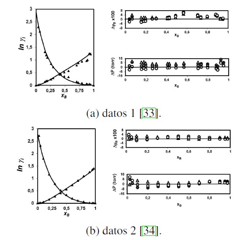 Aunque en este trabajo no hacemos un extenso estudio comparativo con otros modelos de coeficiente de actividad. Sin embargo, los resultados muestran de manera general, que en sistemas homogéneos que presentan algún grado de asociación y polaridad, el modelo SIMÉTRICO es más preciso que los clásicos modelos de dos parámetros como los de Margules y VanLaar. En cuanto al modelo de Wilson, los valores de las desviaciones son bastante similares. Veamos el caso ilustrativo: Agua + n-Propanol a 60ºC, el cual es un sistema binario donde esperamos que existan simultáneamente auto-asociación, asociación cruzada, además de un cierto grado de repulsión hidrofóbica. La Figura 4 muestra la representación de dos conjuntos de datos diferentes y sus respectivas desviaciones en Presión (∆P) y composición de vapor (∆y). En el recuadro (a), se muestra un conjunto de datos con mucha dispersión, el cual fue desaprobado por la aplicación del test consistencia de Herington [28]. Vemos que este grado de dispersión afecta por igual la precisión de todos los modelos. Con respecto al conjunto de datos mostrado en el recuadro (b), este muestra una dispersión menor y mucha mayor consistencia [28]. Pudiéndose comprobar, que la desviación para este tipo de sistema, es comparable las obtenidas por los clásicos modelos Wilson y UNIQUAC.