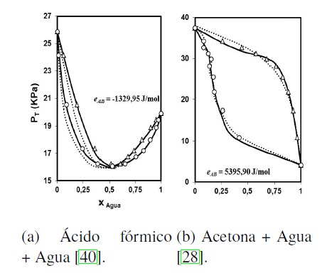 Una de las ventajas de este modelo, aparte de la facilidad de ajuste, consiste en la interpretación física que se le puede dar a su parámetro energético eAB . Como ejemplo podemos considerar los sistemas mostrados en la Figura 6. En ella se observan el equilibrio líquido-vapor para el sistema binario ácido fórmico + agua (Figura 6a), aquí puede observarse que el parámetro energético de nuestro modelo acusa una desviación negativa con su signo (atractivo). Sin embargo, los parámetros energéticos del modelo de UNIQUAC para este mismo sistema son: (u12 −u11) = −617,52 cal/mol y (u21 −u22) = 373,57 cal/mol [28].