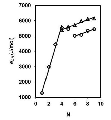 En cuanto a los efectos hidrofóbicos, la Figura 7 muestra la energía de interacción resultante (eAB) para los sistemas: Agua + n-Alcohol, Etanol + n-Alcano y n-Propanol + n-Alcano. Para estas gráficas los datos se extrajeron de la Tabla 1. En ella se observa que a excepción del sistema n-Propanol + n-Pentano, que la energía de interacción resultante se hace más repulsiva (incrementa), en la medida que la cadena hidrocarbonada del compuesto hidrofóbico aumenta (grupo –CH2–), que es concordante con el incremento en la desviación positiva de la ley de Raoult, observada en estas mezclas. Por otro lado, es importante resaltar que el efecto que causa el incremento del grupo –CH2– sobre eAB , es más pronunciado para el caso Agua + n-Alcohol. Mientras que en los otros sistemas, tiene un incremento casi constante, puesto que la respuestas, tanto para Etanol + n-Alcano, como n-Propanol + n-Alcano, muestran rectas casi paralelas. Estas respuestas parecen guardar correspondencia con las constantes dieléctricas, puesto que el Agua posee un alto valor (82), mientras que el Etanol y n-Propanol poseen valores más bajos (24 y 20 respectivamente), haciéndolos más tolerantes la presencia del grupo –CH2–, por ser éstos últimos, solventes que poseen menor carácter polar.