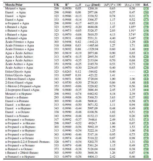 La Tabla 1 muestra los resultados para varias mezclas binarias isotérmicas, formada por líquidos que presentan carácter polar y que usualmente presentan asociaciones fuertes. Vemos que el presente modelo puede representar la energía libre en exceso para estos sistemas con buena aproximación, ya que la correlación lineal R2 en la mayoría de ellos se encuentra muy cerca de la unidad.