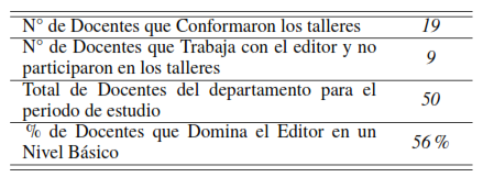 Es de resaltar que a la fecha se han concretado una serie de talleres con docente del Departamento de Matemática Tabla 1 y estos se han realizado con equipos propios de profesores o concedidos en calidad de préstamo, por lo que se espera para la prosecución del proyecto, conseguir fuentes de financiamiento a través de entes públicos, privados y así poder avanzar de manera más eficiente y eficaz en la consecución de las fases de implementación, revisión y especialmente necesario en la fase de expansión, para el cual es imprescindible disponer de un laboratorio de Latex.