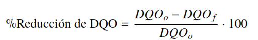 Se determinó el porcentaje de remoción o disminución de la DQO, mediante la ecuación (5):