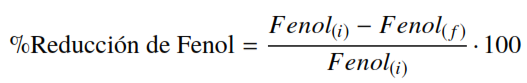 (6)Donde el Fenol(i) es la concentración inicial del proceso de reacción y el Fenol( f ) es el valor final de la fotoreacción. Para este análisis se realizó una curva de calibración del fenol mediante un espectrofotómetro HACH DR2010, aplicando la ley de Lambert-Beer.