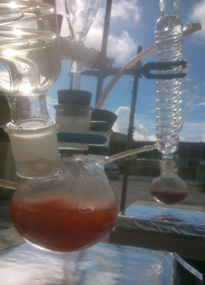 y como variable de respuesta: la DQO, como se observa en la Tabla 1. La reacción de oxidación avanzada solar se llevó a cabo en un balón de tres bocas de volumen 250 mL (vidrio borosilicato), siguiendo la metodología propuesta por Ramos y colaboradores [22], Yamal y colaboradores [23]. Al reactor bach se le agregó un volumen de 100 mL de fenol (Riedel de Haen) con una concentración de 2000 ppm, luego se le añadió el catalizador LRS400 siendo lodo rojo (CVG-Bauxilim) neutralizado con salmuera de ósmosis inversa mejorada con cloruro de magnesio (Sigma-Aldrich y calcinado a 400 °C), a éste slurry se le ajustó el pH con ácido sulfúrico (Sigma-Aldrich) midiéndolo con un pHmetro digital Orión 330 Thermo, seguidamente al balón de reacción se le conectó un embudo de adición para la dosificación de peróxido de hidrógeno al 30 % (grado analítico marca Eka Nobel), además de un tubo de enfriamiento para el control de vapores generados y un termómetro (Fisherbrand) para el seguimiento de la temperatura de reacción, manteniendo una agitación constante a través de un agitador magnético (SLHS-SI Analytics) de acuerdo con el montaje experimental mostrado en la Figura 1.