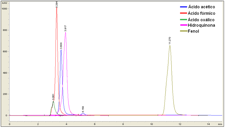 La Figura 2 muestra la secuencia cromatográfica obtenida para la separación de los productos de degradación de fenol y de acuerdo a las condiciones operacionales optimizadas se analizaron las muestras patrones. El pico cromatográfico muestra primero al ácido oxálico eluyendo a un tiempo de retención de 3,061 min, seguido del ácido fórmico con un tiempo de 3,294 min, el ácido acético eluyó a 3,604 min, la hidroquinona fue el siguiente patrón en salir con un tiempo de 3,917 min y por último el fenol con un tiempo de retención de 11,270 min. Estos resultados presentan picos con tiempos de retención bien definidos entre sí.