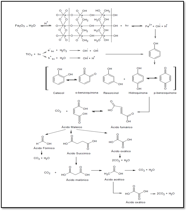 La formación de radicales oxidrilo por vía fotoquímica y fotocatalítica son las especies que darán inicio al proceso de oxidación del fenol. Generalmente se considera que comienza la oxidación con una transferencia de electrones que conduce a la formación del radical fenoxi reaccionando este a su vez con el oxígeno del medio [54, 55]. Este radical fenoxi permite la hidroxilación formando los dihidoxilbencenos a través de los productos de sustitución del OH ortohidroxilación para la formación de catecol, metahidroxilación para el resorcinol y la parahidroxilación de la hidroquinona [56], que con una oxidación adicional y el correspondiente reeemplazo de los hidrógenos por grupos OH se forman las o-benzoquinonas y p-benzoquinonas tal y como afirman Eftaxias y colaboradores [51]. Por su parte, la apertura del anillo de la hidroquinona genera directamente ácidos insaturados como maleico y furmárico [56, 57]. Las benzoquinonas pueden ser degradadas a través del ácido 2,5-dioxo-3-hexenodioico, es decir sin pasar por el ácido maleico, debido a que este ácido es altamente reactivo y efímero, por lo que las benzoquinonas podrían producir directamente ácido oxálico [51].