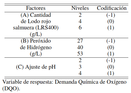 [24] K. Ramos y Y. Jiménez, “Aplicación de diseño de experimentos en la degradación de desechos por el proceso foto-Fenton heterogéneo usando un óxido mixto de MgFeAl,” Saber, vol. 28, no. 3, pp. 574–582, 2016.