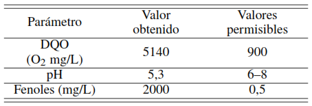 Según los resultados de los análisis químicos, los componentes de la muestra sintética inicialmente sobrepasan los límites de concentración permisibles para las descargas establecidas por la norma venezolana de aguas, según Decreto 883, 1995 [26], el cual establece las condiciones de descarga en efluentes y plantas de tratamientos para los contaminantes acuosos, tal como se observa en la Tabla 2. Donde se evidencia el carácter contaminante de este compuesto en solución y la necesidad de la aplicación de un tratamiento para poder ser descargado a los sistemas municipales e industriales de aguas servidas.