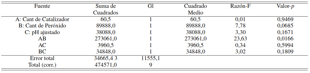 Por lo antes expuesto, el peróxido (valor-p: 0,0685) es de gran importancia por ser el agente oxidante en la reacción, a pesar de no haberse encontrado un efecto significativo en el ANOVA, de la misma forma no tienen relevancia la cantidad de catalizador (A valor-p 0,9469) y ajuste del pH (C valor-p 0,1671). Este DDE permitió obtener las condiciones de reacción para reducir la DQO de 5140 ppm a 300 ppm en un medio acuoso utilizando como catalizador lodo rojo activado para tratar una alta concentración de fenol.