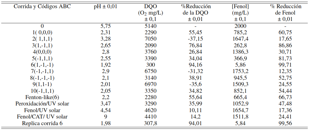 Los blancos que se registran en la Tabla 4, permitieron analizar el comportamiento de cada subproceso de oxidación existente en la degradación de la especie molecular. El primer blanco se refiere al proceso Fenton-like(6), el cual consistió en aplicar las condiciones experimentales de la corrida 6, pero sin aplicar radiación solar. Evidenciándose en esta reacción POA no fotoquímico una reducción de la DQO equivalente al 55,64 % de la inicial y una reducción de la concentración de fenol en un 66,73 %, evidenciando la eficiencia de este tipo de POA. Estos resultados obtenidos con la reacción no fotoquímica Fenton-Like son inferiores a los obtenidos con la técnica fotoquímica, lo que evidencia que la fuente de radiación sobre la reacción incrementa sustancialmente la generación de radicales libres y en consecuencia mejora el rendimiento de la reacción fotoquímica considerablemente [9, 12, 42, 43].