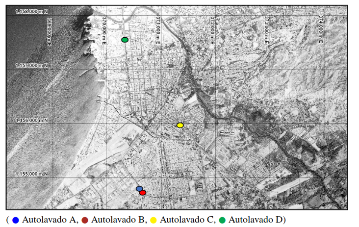 Con la finalidad de reservar el nombre del establecimiento y todos los resultados obtenidos durante la investigación, se identificaron los autolavados con la nomenclatura: A, B, C y D, referidas a cada autolavado, ubicándolos geográficamente mediante coordenadas UTM PSAD 56 Venezuela, según las coordenadas: