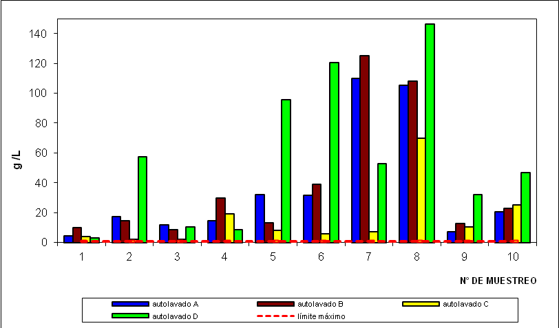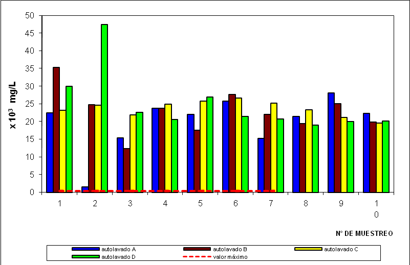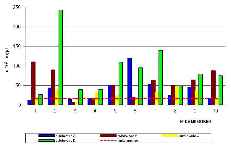 Por otra parte, se puede observar en la Figura 4 que los valores de aceites y grasas de todos los autolavados sobrepasan el valor máximo permisible (0,02 g/L) en la Gaceta Oficial de la República de Venezuela N° 5021, decreto 883, sección V, del 18 de diciembre de 1995.
