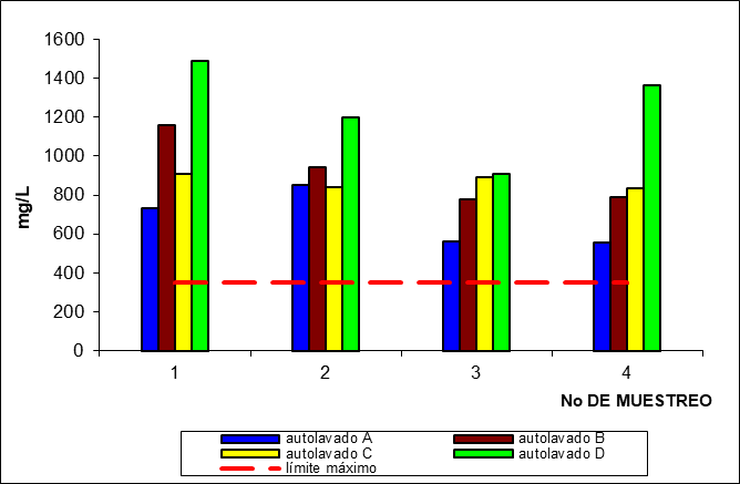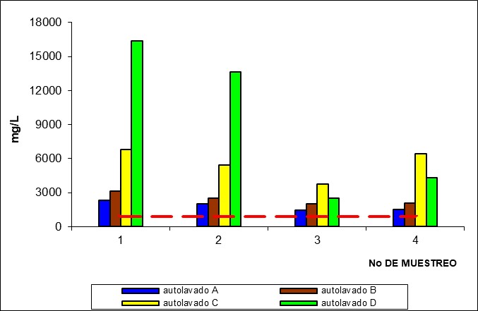 La alta concentración de sólidos suspendidos totales en esta agua puede ser atribuible a la presencia de materiales que no fueron disueltos en el agua como, por ejemplo, material arcilloso, mezcla aceites y polvo, entre otros, los cuales presentan un diámetro mayor a 0,47 µm y fueron retenidos por el medio filtrante. Comparando los valores obtenidos de SST con los resultados de Gutiérrez (2012), las aguas residuales de autolavados discrepan de los resultados encontrados por estos investigadores (presentan concentraciones mucho más elevadas), pudiendo atribuir esto al origen y la naturaleza de las aguas residuales [6]. Además, se puede observar en la Figura 3, que las concentraciones de sólidos suspendidos totales en cada uno de los autolavados se encuentran por encima del valor máximo permisible (400 mg/L) establecido en la normativa ambiental.