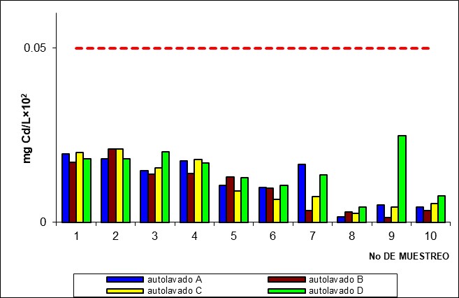 En la Figura 7 se presenta la variación de cadmio en las aguas residuales de los distintos autolavados, se observa un valor máximo de 0,03 mg Cd/L, y un valor mínimo de 0,001 mg Cd/L. La presencia de cadmio en las aguas residuales se relaciona con algunos procesos químicos, por ejemplo, se usa en forma de óxido en la fabricación de las baterías, en la producción de pinturas y como catalizador en la refinación del petróleo, este último puede representar uno de los principales aportes de cadmio en esta agua, además la presencia de este metal también puede ser debido al proceso de galvanoplastia [20]. Se puede observar en la Figura 7 que la concentración de cadmio se encuentra por debajo del valor máximo permisible 0,20 mg Cd/L, establecido en la normativa ambiental.