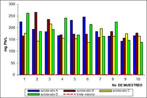 Mediante la Figura 8 se representa la variación de la concentración de plomo total en las aguas residuales, se observan los valores máximos de 265,55 mg Pb/L para el autolavado B, y 261,36 mg Pb/L, y un valor mínimo de 137,64 mg Pb/L. La presencia de plomo en las aguas residuales provenientes de los autolavados puede ser debida al desgaste de la pintura de los vehículos (muchos pigmentos contienen plomo como constituyente de su formulación), también en considerable el aporte de plomo mediante derrames de líquido o partículas desprendidas de las baterías de los vehículos.