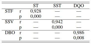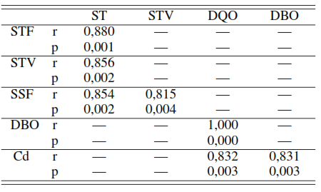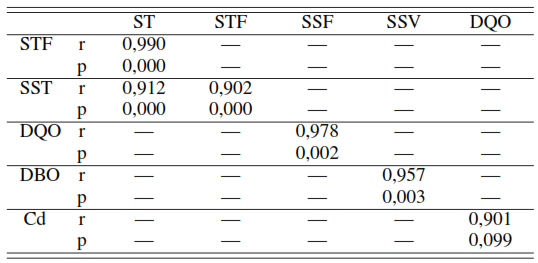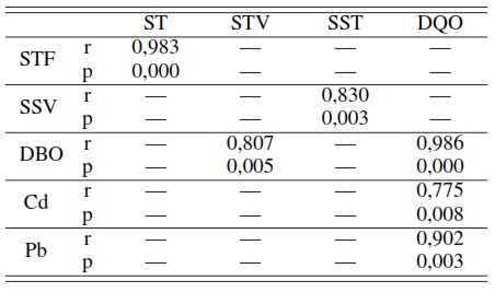 Para la relación altamente significativa que se presenta entre los SSV y la DBO (r = 0, 957 y p = 0, 003) se revela la estrecha relación entre el material orgánico volátil y la materia orgánica carbonosa representado por la DBO, es decir, una manera de determinar el contenido de materia orgánica en este tipo de residuales es mediante la determinación de SSV.