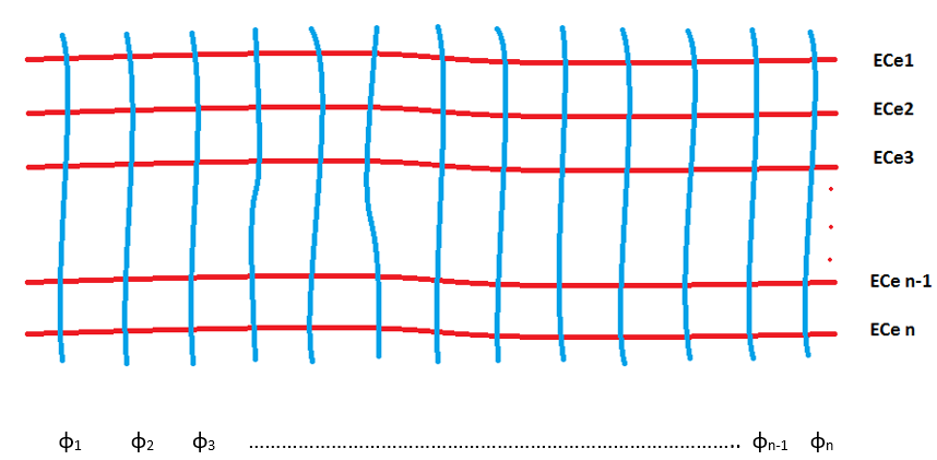 Un modelo físico que nos permita experimentar con los diferenciales de flujo en función de la conductividad eléctrica del suelo, dadas las composiciones de sus capas respectivas, se puede representar de esta manera, donde los elementos de los electrodos conforman una malla de lineas de flujo y lineas de potencial como se muestra en la Figura 8.