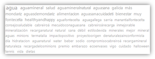 Como cabría esperar, muchas de las palabras que se repiten con mayor frecuencia se corresponden con los diferentes hashtags utilizados por las distintas marcas, especialmente dentro de las campañas publicitarias o de comunicación activas en el período estudiado, como es el caso de “aguasanacuidadeti”, “healthandhappy” (también de Agua Sana) o “recarganatural” (de Cabreiroá). Otros hashtags muy utilizados hacen referencia a Galicia, el territorio del que provienen todas las aguas estudiadas, como es el caso de “aguagallega” (varias marcas) o “sarria” (Fontecelta). También sobresalen aquellos relacionados con el medio ambiente, como “proyectoorigen” o “ecoenvases”, ambos de Cabreiroá. Otros hashtgas hacen referencia a ediciones especiales de packaging, como el caso de “recargadelosminions”, con el que Cabreiroá da a conocer su colección de botellas pequeñas de agua dedicadas a los Minions, cuyo target es el público infantil.
