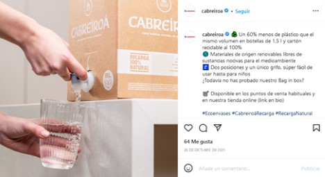 En este caso, destaca por su frecuencia Cabreiroá, quien hace hincapié en sus envases de aluminio (material del que indica que es infinitamente reciclable), de vidrio retornable y reutilizable, así como de la salida al mercado de un envase innovador: Bag in box. Además, acompaña a estas publicaciones con el hashtag #ecoenvases. La publicación que realiza esta marca en su cuenta de Instagram el 20 octubre es especialmente clarificador: