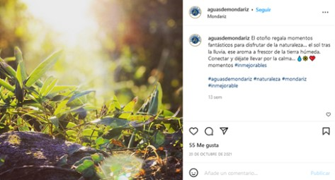 Mondariz [@aguasdemondariz] (s.f.). Publicaciones entre el 9/10/21 y el 9/12/21. Instagram. https://www.instagram.com/aguasdemondariz/?hl=es