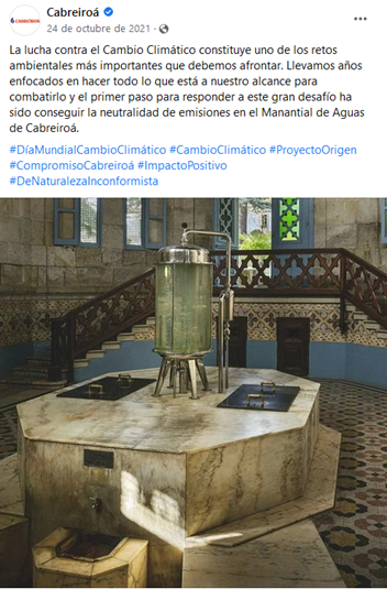 El “medioambiente”, como término más amplio que la “naturaleza”, por su parte, se relaciona con la neutralidad de emisiones, con las efemérides dedicadas a él, como es el caso del Día internacional contra el cambio climático, con los patrocinios deportivos que celebran eventos cada vez más sostenibles, como es el caso de Cabreiroá en el Meo Vissla Pro Ericeira, con los envases sostenibles y el origen natural de las aguas, así como con los hashtags a él dedicados expresamente, como es el caso de “medioambiente” o “environment”, utilizados por Sousas.
