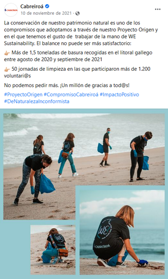 El caso más llamativo es el de Cabreiroá que hace de la sostenibilidad su elemento diferenciador y lo integra como valor de marca. La mayor parte de su comunicación gira alrededor de ella y no únicamente desde su aspecto medioambiental, sino también social e innovador, poniendo en gran valor su compromiso con la sostenibilidad.