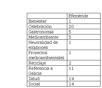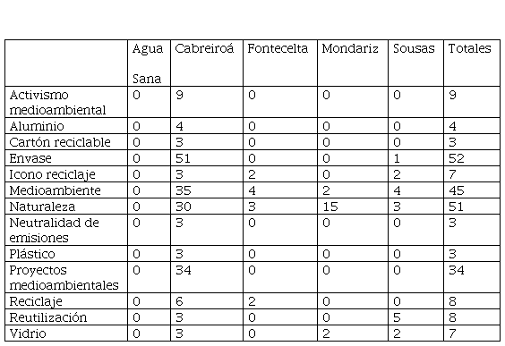 Al estudiar las temáticas que no hacen referencia al medio ambiente (aunque algunas tengan relación con él, como es el caso de su origen natural, por razones obvias, y el de las características del agua, que vienen dadas por la propia naturaleza), destacan la salud, el bienestar, las referencias a Galicia, las efemérides y las características del agua, tal y como se puede observar en la tabla 5, siendo representativas la salud, las efemérides y las referencias a Galicia, tratadas por todas las marcas, ya sea de forma directa o indirecta.