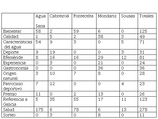 Se pudo conocer que sólo hay un tema del que hablen todas y cada una de las marcas estudiadas en este trabajo, Agua Sana, Cabreiroá, Fontecelta, Mondariz y Sousas: la salud. Una temática intrínseca a las propiedades del agua mineral natural y a su uso a lo largo de la historia. Incluso una de las marcas, Agua Sana, hace de ella su elemento diferenciador de la competencia.