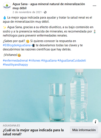 Sin embargo, hay grandes diferencias en la frecuencia de publicaciones que contemplan la salud. Sin duda, quien más trata dicho tema es Agua Sana, que hace de la salud su elemento identificador en cuanto a comunicación, indicando para qué enfermedades es beneficioso el consumo de un agua con las características de la suya, ofreciendo consejos sobre cómo mejorar nuestra salud, fomentando un estilo saludable de vida y potenciando el bienestar, todo ello ayudado por el consumo de agua, algo que hace tanto a través de los posts en sus redes como de su blog, en el que desarrolla más en profundidad sus publicaciones, llevando así tráfico desde las redes a su web.