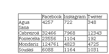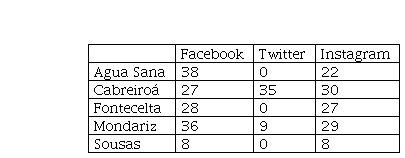 No obstante, cabe destacar que Agua Sana, Foncelta y Sousas no publican en sus perfiles de Twitter desde el 25 de marzo de 2020 en el primer caso, desde 9 de abril de 2019 en el segundo y en el tercero, desde el 23 de marzo de 2020.