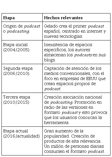El podcast como producto radiofónico comenzó a ser relevante mundialmente en 2005 (Marín, 2019). En la etapa pre-digital, imperaba la radio como medio sonoro (García, 2020). Se emplea internet como acceso en el que almacenar el contenido publicado por las grandes cadenas. Posteriormente, los soportes que contenían las obras radiofónicas ya emitidas comenzaron a proporcionar mayor contenido en la red de forma complementaria.