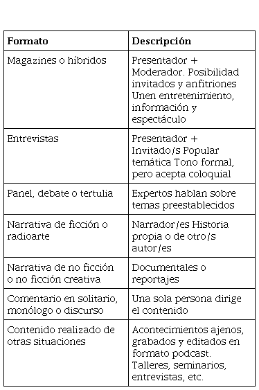 No existe consenso entre los investigadores sobre una tipología de formatos de podcast. Checa (2015) establece unos formatos, que después matiza Leonard (2017) y que García y Cartes (2022) estructuran en siete: