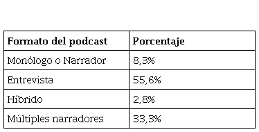 Para este análisis de contenido, se han tomado 12 podcast y 36 episodios diferentes, tres por cada podcast. Esta técnica se ha dividido en 17 variables. Tras dicho análisis, se observa que el idioma más empleado es el español, pues de los 36 podcasts analizados, 21 son en este idioma, lo que supone un 58,3% del total. Los restantes son consumidos en idioma “inglés”. En cuanto al formato más empleado por el corpus propuesto, destaca la “entrevista”, con 20 de los 36 podcasts analizados, un 55,6%.