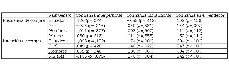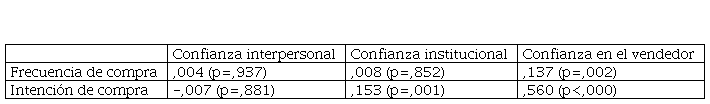 Tabla 2. Correlaciones de Pearson entre la frecuencia e intención de compra y la confianza.