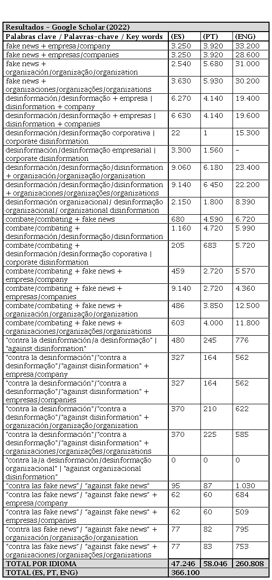 De esta forma, efectuándose búsquedas en tres idiomas (inglés, español y portugués) y, respondiendo a la necesidad de variación de número, cuando ha sido posible, se ha realizado una revisión sistemática de las fuentes consultadas con un criterio de selección de búsqueda de los términos “fake news” + “empresa” u “organización”, ”desinformación” + “empresa” u “organización’”, “desinformación corporativa”, “desinformación empresarial”, “desinformación” + “organización”, “desinformación organizacional”, “combate” + “fake news”, “combate” + “desinformación”, “combate” + “desinformación corporativa”, “combate” + “fake news” + “empresa”, “combate” + “fake news” + “organización”, “contra la desinformación”, “contra la desinformación” + “empresa”, “contra la desinformación” + “organización”, “contra la desinformación organizacional”, “contra las fake news”, “contra las fake news” + “empresa” y “contra las fake news” + “organización”.