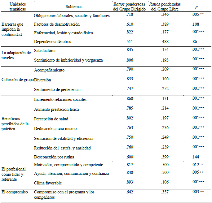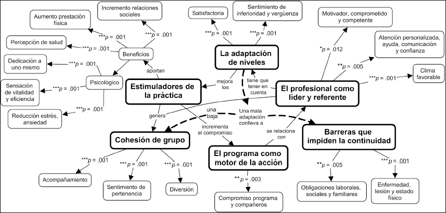 Estos valores los expresamos en un mapa conceptual (Figura 1) en el que insertamos los valores . de la prueba binomial de la comparación de proporciones y en el que también expresamos mediante conectores la relación de las unidades temáticas y subtemas encontrados. El mapa muestra que las valoraciones más sobresalientes y significativas del grupo dirigido en comparación al grupo libre son: las barreras de enfermedades y lesiones y los sentimientos de inferioridad y vergüenza. También podemos ver que los beneficios más percibidos por el grupo dirigido son: la prevención de salud, la dedicación de uno mismo, la sensación de vitalidad y la reducción del estrés. Y finalmente, al profesional como motivador comprometido capaz de ofrecer ayuda y confianza.