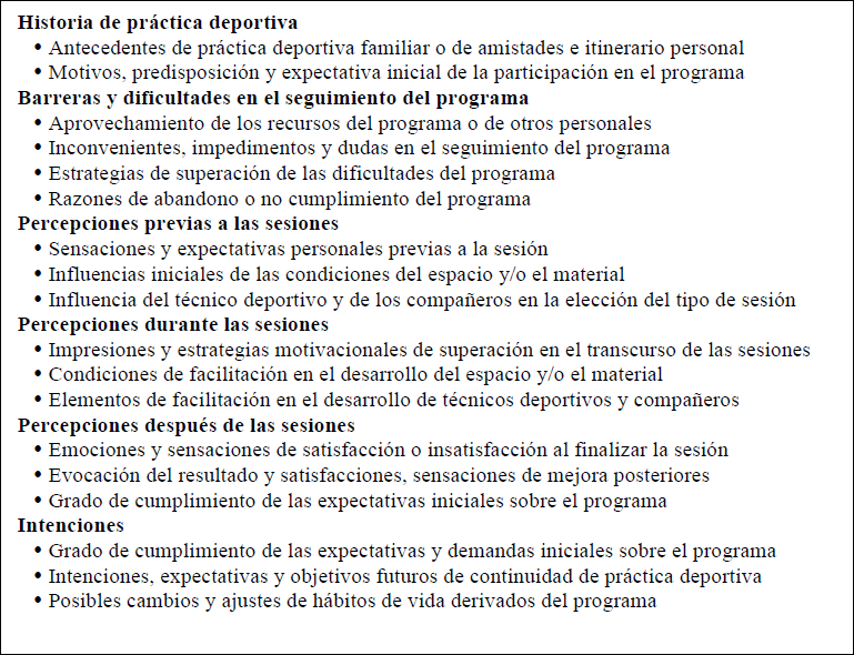 Diario pautado (Surbeck, Han y Moyer, 1991; Zabalza, 2008). Se elaboró con dimensiones derivadas del marco teórico (Deci y Ryan, 2000) (Tabla 1) para captar las motivaciones, percepciones y dificultades en el desarrollo de cada sesión, siendo equiparables a las dimensiones de la entrevista.