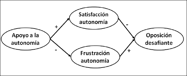 A pesar de las evidencias científicas, en el ámbito de la EF la tendencia a usar estilos controladores parece estar todavía extendida entre el profesorado (Taylor, Ntoumanis, y Smith, 2009) lo que puede generar una importante frustración de las NPB en el alumnado (Bartholomew, Ntoumanis, Cuevas, y Lonsdale, 2014; Haerens y col., 2015). Según los postulados de la TAD, la frustración activa de las NPB puede provocar actitudes defensivas para hacer frente a dichas experiencias negativas (Deci y Ryan, 2000; Vansteenkiste y Ryan, 2013). En este sentido, una de las consecuencias negativas de índole comportamental que se pueden desencadenar cuando el profesorado se decanta por estrategias más controladoras es que los estudiantes adopten una conducta de oposición desafiante (Haerens y col., 2015). Esta actitud, que puede desencadenarse como una estrategia de defensa hacia la presión del profesorado sobre el alumnado, se caracteriza por retar constantemente al docente, desafiando sus peticiones y actuando en sentido contrario a las expectativas que el profesorado tiene de su alumnado. En esta línea, existen estudios que muestran como un entorno familiar de apoyo a la autonomía (e.g., libertad de decisión para la organización de las tareas, elección libre de las amistades o actividades de ocio, entre otras) se relaciona negativamente con la conducta de oposición desafiante en adolescentes (Van Petegem, Vansteenkiste, Soenens, Beyers, y Aelterman, 2015), mientras que por el contrario, los adolescentes que perciben un alto control parental tienden a desafiar las reglas familiares frecuentemente (Vansteenkiste, Soenens, Van Petegem, y Duriez, 2014). De manera análoga a los resultados encontrados en la literatura, el presente estudio postula que la satisfacción de la autonomía del alumnado en las clases de EF puede estar asociada negativamente a una conducta desafiante debido a que el alumnado puede sentirse partícipe de su proceso de enseñanza-aprendizaje, mientras que la frustración de esta se asociará positivamente a la oposición desafiante del alumnado..