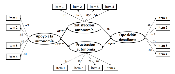 El modelo de ecuaciones estructurales planteado se testó en dos pasos. En primer lugar, se realizó un modelo de medición con cuatro constructos latentes y a través de 16 medidas observadas. Cada uno de los constructos latentes estaba compuesto por cuatro medidas observadas (i.e., los cuatro ítems que componen cada variable). Los índices obtenidos por el modelo de medición fueron adecuados: x2 = 186.38; p <.001; x2/g.l. = 1.90; RMSEA = .068; SRMR = .062; CFI = .946; TLI = .934. Posteriormente, se testó simultáneamente el modelo estructural y el modelo de medición, el cual presentaba igualmente un ajuste adecuado a los datos (x2 = 188.05; p <.001; x2/g.l. = 1.88; RMSEA = .068; SRMR = .065; CFI = .946; TLI = .935). En este modelo, se puede comprobar cómo el apoyo a la autonomía predijo positiva y significativamente la satisfacción de la misma (β =.609, p<.001), mientras que el apoyo a la autonomía predijo negativa y significativamente la frustración de ésta (β =-.292, p<.001). Esta frustración de la necesidad de autonomía predijo positiva y significativamente la oposición desafiante (β =.348, p<.001) mientras que no se halló una predicción significativa de la satisfacción de la autonomía sobre la oposición desafiante (β=-.086, p=.278). La proporción de varianza explicada por el modelo de la variable de oposición desafiante fue de un 14%, mientras que para la satisfacción y frustración de la autonomía la varianza explicada por el modelo fue de un 37% y un 9% respectivamente.