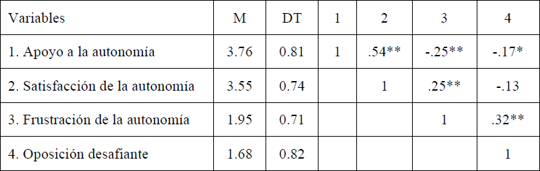 En primer lugar, los resultados del análisis correlacional (Tabla 1) mostraron como a nivel situacional, con relación a las unidades didácticas evaluadas (i.e., atletismo y rugby tag), el apoyo a la autonomía correlacionó positiva y significativamente con la satisfacción de autonomía (r=.54; .<.001), mientras que lo hizo en sentido contrario con la frustración de la autonomía (r=-.25; .<.001) y con la oposición desafiante (r=-.17; .<.005). Del mismo modo, la frustración de la autonomía se relacionó positiva y significativamente con la oposición desafiante (r=.32; .<.001).