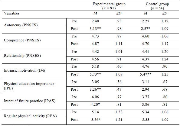 After the intervention, the data analysis (Table 1) showed that the experimental group improved in autonomy (p < .01), intrinsic motivation (p < .01), importance given to physical education (p < .01), intention to do sport (p < .05) and regular physical activity (p < .05). The control group, however, only improved in the autonomy mediator (p < .05) and in intrinsic motiation (p < .01).