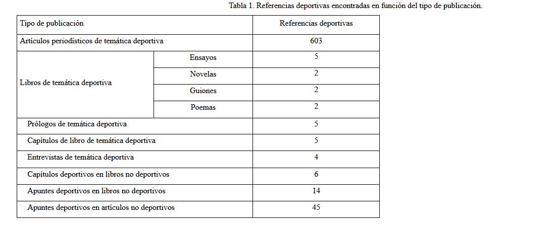 En cuanto al tipo de publicación, en la Tabla 1 se exponen la cantidad de referencias deportivas correspondientes a artículos periodísticos, libros, capítulos de libros, prólogos y entrevistas teniendo en cuenta la temática deportiva o no de dichas publicaciones. El 89.7% de los textos deportivos (628) tienen un contenido o un título explícitamente deportivo, mientras que solamente el 10.3% (72) corresponden a capítulos de libro o comentarios aparecidos en publicaciones dedicadas a otra temática diferente.