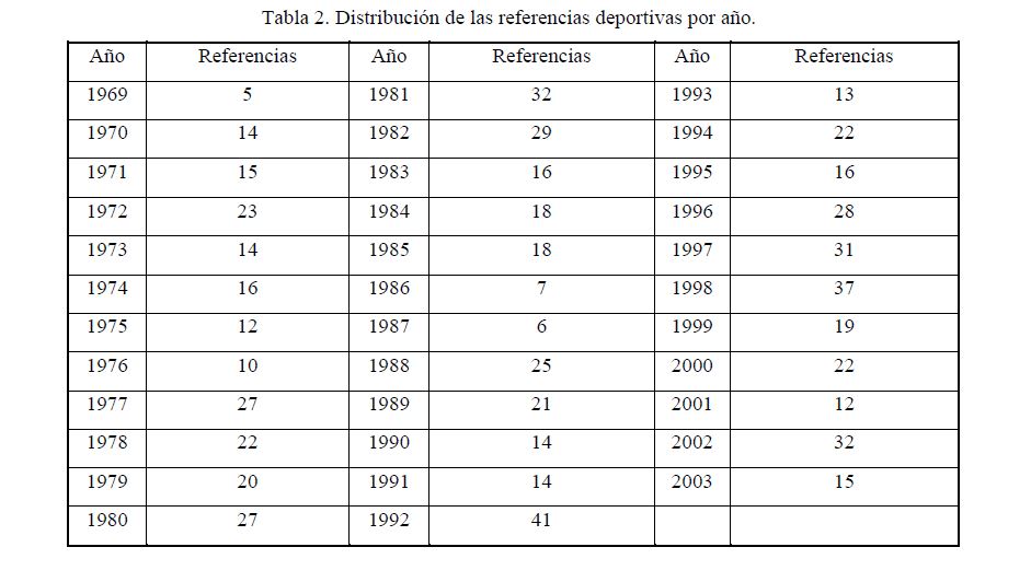 Respecto a su distribución por décadas no existen grandes diferencias y la media anual tanto en los años setenta como en los ochenta y los noventa oscila entre 17 y 23 escritos deportivos, aumentando progresivamente. Entre los años 2000 y 2003 la producción deportiva continúa siendo de más de veinte textos por año.