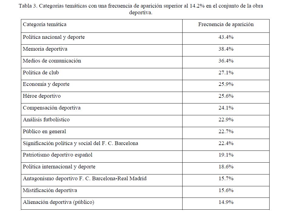 El análisis de contenido muestra la existencia de 16 categorías temáticas con un frecuencia de aparición superior al 14.2%, es decir, presentes en más de 100 escritos deportivos, una cifra bastante significativa. En la Tabla 3 aparecen cada uno de estos temas ordenados en función de su importancia en el conjunto de la obra deportiva. Por encima del resto destacan tres categorías: “política nacional y deporte” (43.4%), “memoria deportiva” (38.4%) y “medios de comunicación” (36.4%). Además, también son significativas las categorías temáticas relacionadas con los aspectos económicos, “economía y deporte” (25.9%); la crítica marxista, “héroe deportivo” (25.6%), “compensación deportiva” (24.1%), “mistificación deportiva” (15.6%) y “alienación (público)”; el simbolismo del F. C. Barcelona (22.4%); la política internacional (18.6%) y la rivalidad entre el F. C. Barcelona y el Real Madrid (15.7%).