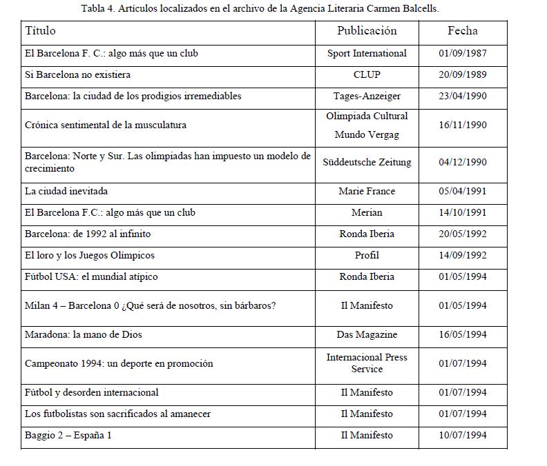 Por otro lado, el tercer volumen de la obra periodística montalbaniana editado por Francesc Salgado (2012) puso al descubierto la existencia de artículos publicados en la prensa extranjera. A través de la Agencia Literaria Carmen Balcells, y de su secretaria Carina Pons, se realizaba todo el proceso de solicitud y remisión de estos artículos. Por esta razón, en los archivos de esta empresa se conservan los textos que Vázquez Montalbán escribía para ser enviados posteriormente a cada una de las publicaciones y las fichas con el registro de la fecha de salida y del cobro o no del artículo. Entre estos documentos se hallaron 37 referencias deportivas, pertenecientes en su práctica totalidad a publicaciones extranjeras, no catalogadas anteriormente (Tabla 4).