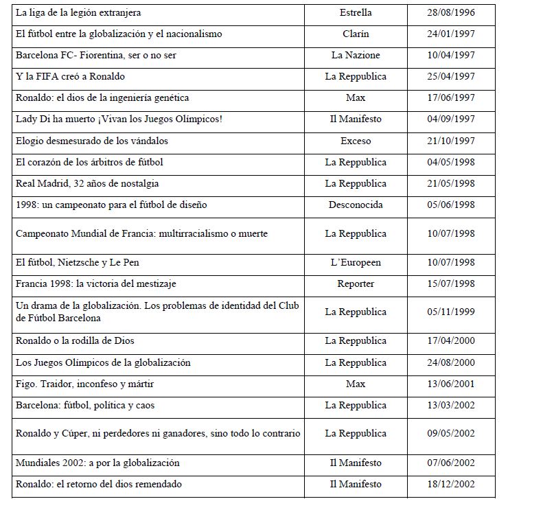 Estos escritos pertenecen mayoritariamente (34) a diarios o revistas extranjeras,6 algunos de los cuáles reproducen prácticamente el mismo texto o aprovechan artículos publicados previamente en España. En estas publicaciones internacionales dio a conocer el significado político y social del F. C. Barcelona, denunció las transformaciones urbanísticas de la ciudad condal en función de los intereses empresariales con motivo de los Juegos Olímpicos, analizó diversas cuestiones políticas, sociales y deportivas relacionadas con los Mundiales de Francia (1998) y Estados Unidos (1994) y valoró la trayectoria futbolística de Diego Armando Maradona.